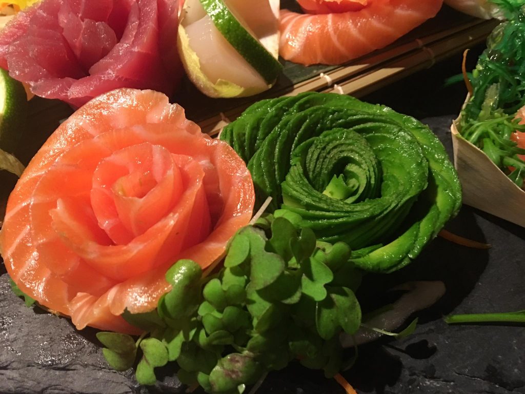 Lachs. Philadelphia Käse, Rucola, umhüllt mit geflammtem Thunfisch und Wasabi-Crème, Gurke